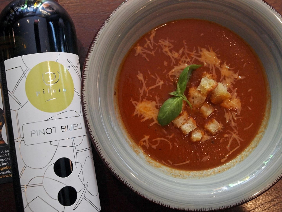 Toskanska juha od rajčice jedna je od omiljenijih na jelovniku Floresa, a izazovna uloga sparivanja s vinom, uspješno je izvedena uz sugestiju pojedinih vinskih stručnjaka i samog vinara, Sanjina Pilata iz Lašića kod Vižinade. Vinar je, nažalost, bio spriječen, ali je vino i vinariju novinarskoj publici na eventu približio poznati promotor Marko Havaši, naglasivši da je pinot bijeli vrlo rijetka sorta u Istri. Pokazalo se da se svježi Pilato Pinot bijeli 2021, malo izraženije arome i blagih kiselina, dobro nosio s aromatičnom juhom spravljenom od 'Pasirane dalmatinske rajčice' Šjora Pomidora.