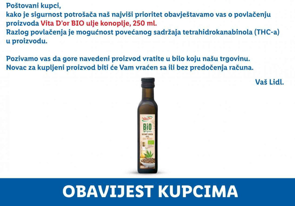 U četvrtak je i hrvatsko Ministarstvo poljoprivrede izvijestilo o opozivu proizvoda Vita D´or BIO ulje konoplje od 250 mililitara zbog mogućeg povećanog sadržaja tetrahidrokanabiola (THC-a).