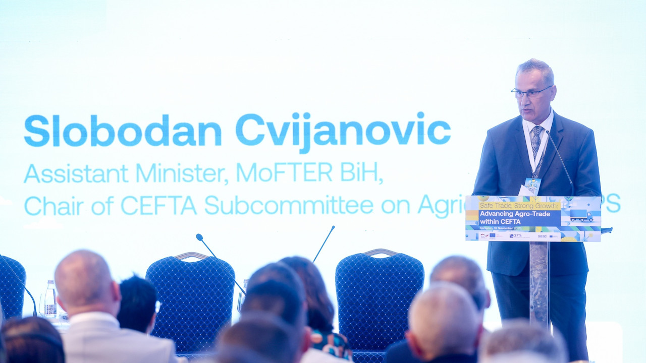 Danas je, u okviru predsedavanja Bosne i Hercegovine CEFTA Potkomitetom za poljoprivredu i SPS, Ministarstvo vanjske trgovine i ekonomskih odnosa (MVTEO) organizovalo konferenciju "Sigurna trgovina, snažan rast" u Sarajevu. Događaj je bio fokusiran na unapređenje trgovine poljoprivrednim proizvodima i jačanje sigurnog poljoprivredno-prehrambenog tržišta u regionu. Ključne teme uključivale su digitalizaciju procedura, jačanje kontrola zasnovanih na proceni rizika i unapređenu koordinaciju među SPS institucijama – sve sa ciljem obezbeđivanja brže, sigurnije i predvidljivije trgovine poljoprivrednim proizvodima. Učesnici su naglasili značaj sistema kao što su SEED+ i CEFTA TRACES NT, koji pomažu u smanjenju administrativnih opterećenja i povećanju institucionalnog poverenja. Ovo je završni događaj tokom predsedavanja Bosne i Hercegovine CEFTA-om u 2025. godini, koji još jednom potvrđuje snažnu posvećenost podršci CEFTA stranama u jačanju kapaciteta i pripremi za sledeću fazu regionalne integracije u 2026. godini. Zahvaljujemo Evropskoj uniji, Nemačkom saveznom ministarstvu za ekonomsku saradnju i razvoj, GIZ-u, projektu EU4Trade, projektu SEED+ i CEFTA Sekretarijatu na kontinuiranoj podršci tokom predsedavanja Bosne i Hercegovine, rekao je Slobodan Cvijanović, pomoćnik ministra u MVTEO Bosne i Hercegovine, predsedavajući CEFTA Potkomiteta za poljoprivredu i SPS.