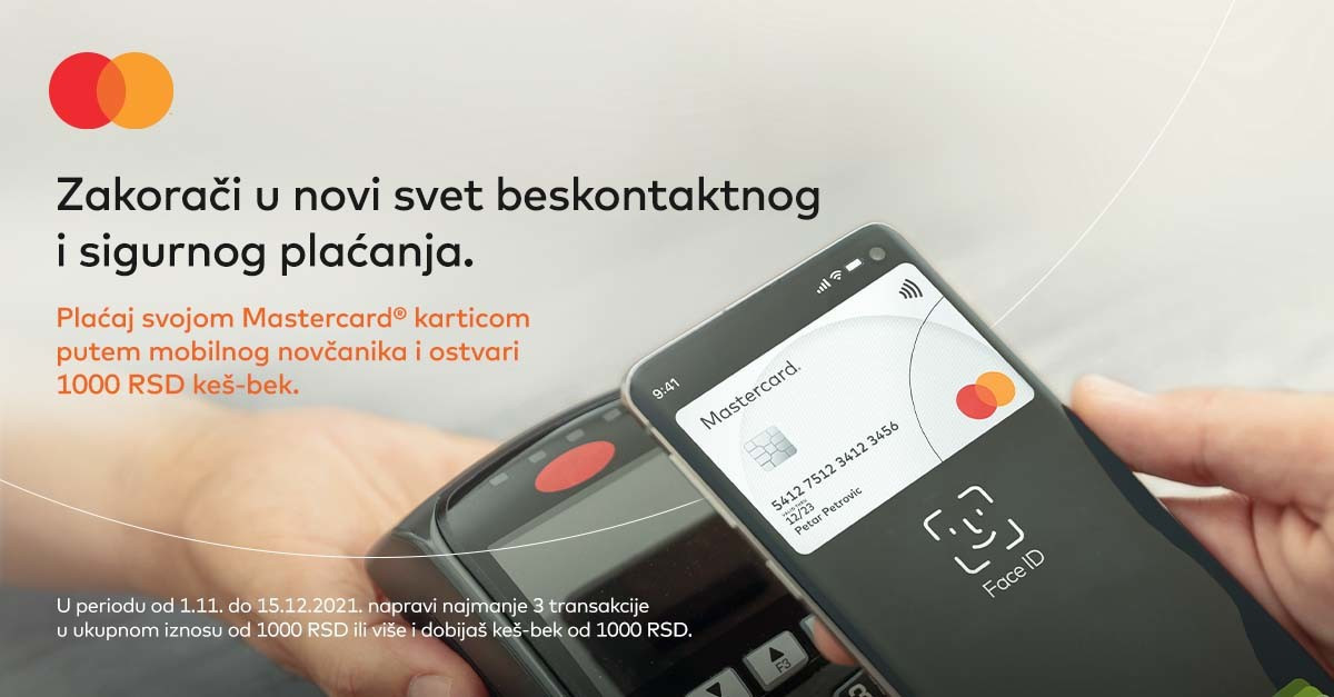Naime, Svi korisnici Mastercard kartica koji koriste mobilne novčanike od 1. novembra do 15. decembra 2021. imaju priliku da ostvare povrat novca na svoj račun. Potrebno je da izvrše tri ili više plaćanja mobilnim novčanikom u okviru kog je digitalizovana Mastercard kartica, na prodajnom mestu bilo kog domaćeg trgovca u kumulativnom iznosu od minimum 1.000,00 dinara i dobijaju povraćaj iznosa od 1.000,00 dinara na svoj račun.