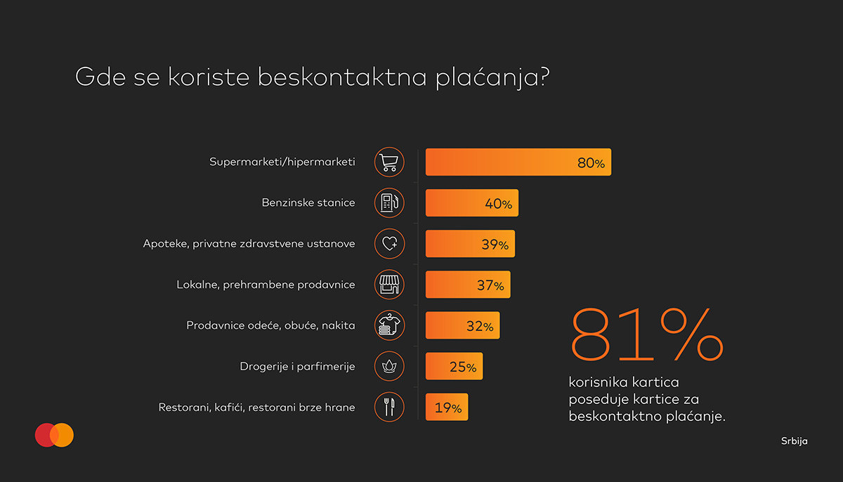 Masterindex istraživanje je takođe pokazalo da korisnici najčešće koriste brza i sigurna beskontaktna i mobilna plaćanja u supermarketima (80%), na benzinskim stanicama (40%) apotekama i privatnim zdravstvenim ustanovama (39%), a tu su još i male komšijske radnje (37%) i prodavnice odeće i obuće (32%).