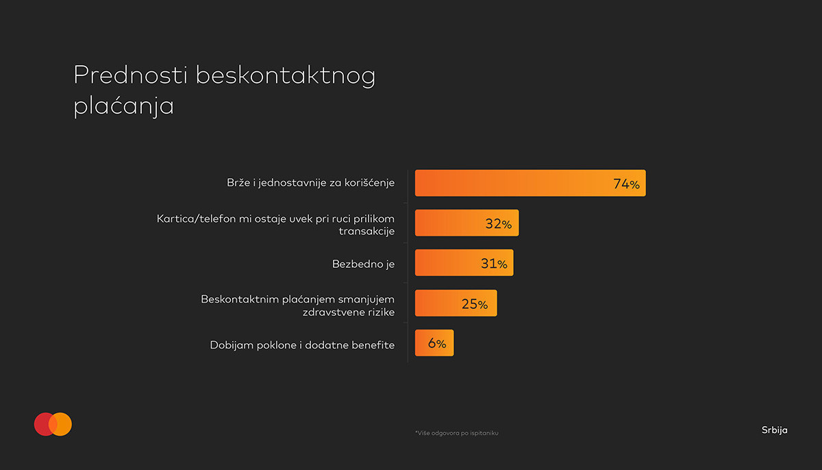 Kao glavnu prednost beskontaktnih plaćanja, MasterIndex ispitanici ističu da su ona brža i jednostavnija od drugih platnih metoda (58%), a ukazali su i na više aspekata njihove sigurnosti – počevši od toga da kartica / telefon sve vreme ostaje u ruci korisnika (51%), preko sigurnosnih tehnologija koje su primenjene (27%) do činjenice da beskontaktna plaćanja smanjuju zdravstvene rizike (27%).