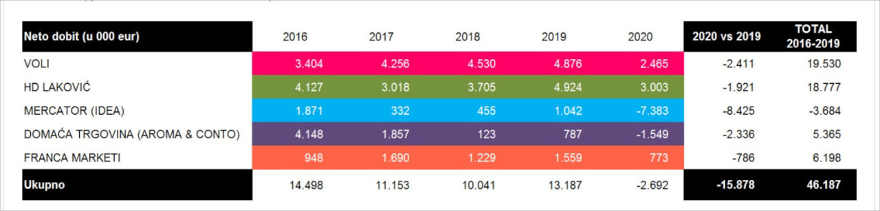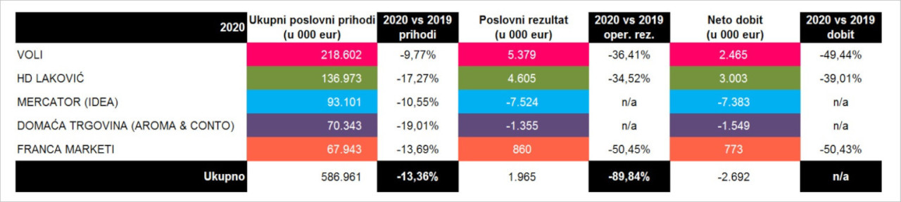 Vodeći lanac u Crnoj Gori ostvario je prihode od gotovo 219 miliona evra, HD Laković je na drugom mestu sa 136 miliona evra i padom od 17%, a najveći pad prodaje pretrpela je Domaća trgovina (Aroma i Conto), čiji je promet smanjen za 19%. Ukupni prihodi svih pet najvećih trgovaca u prošloj godini iznosili su 587 miliona evra, što je 90 miliona evra manje nego 2019. godine.