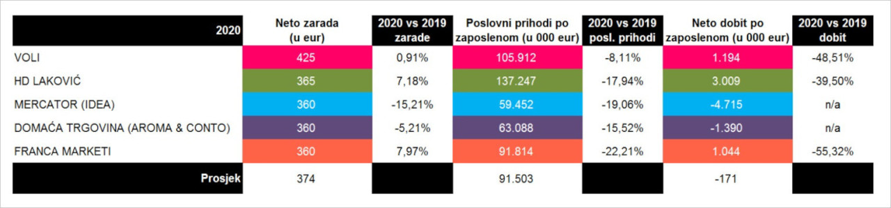 Prema statističkom aneksu godišnjih finansijskih izveštaja, najveću prosečnu zaradu u 2020. godini, ako se odbiju porezi i doprinosi, beleži Voli sa prosečnom platom od 425 evra, dok je plata kod ostalih većih trgovaca manja od nacionalnog proseka (384 evra).