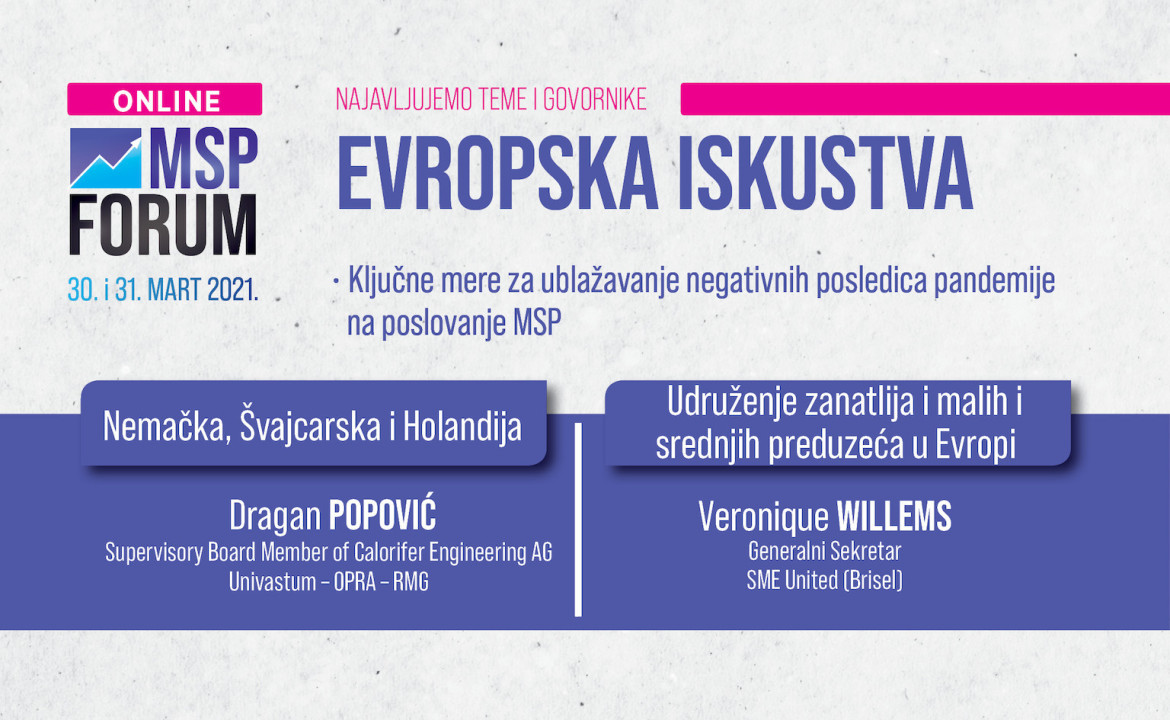 Tokom dvodnevnog MSP Foruma (30. i 31. marta), gledaoci će imati jedinstvenu priliku da čuju kakva su iskustva, izazovi i ključne mere ublažavanja posledica pandemije na poslovanje malih i srednjih preduzeća u zemljama Evropske unije.