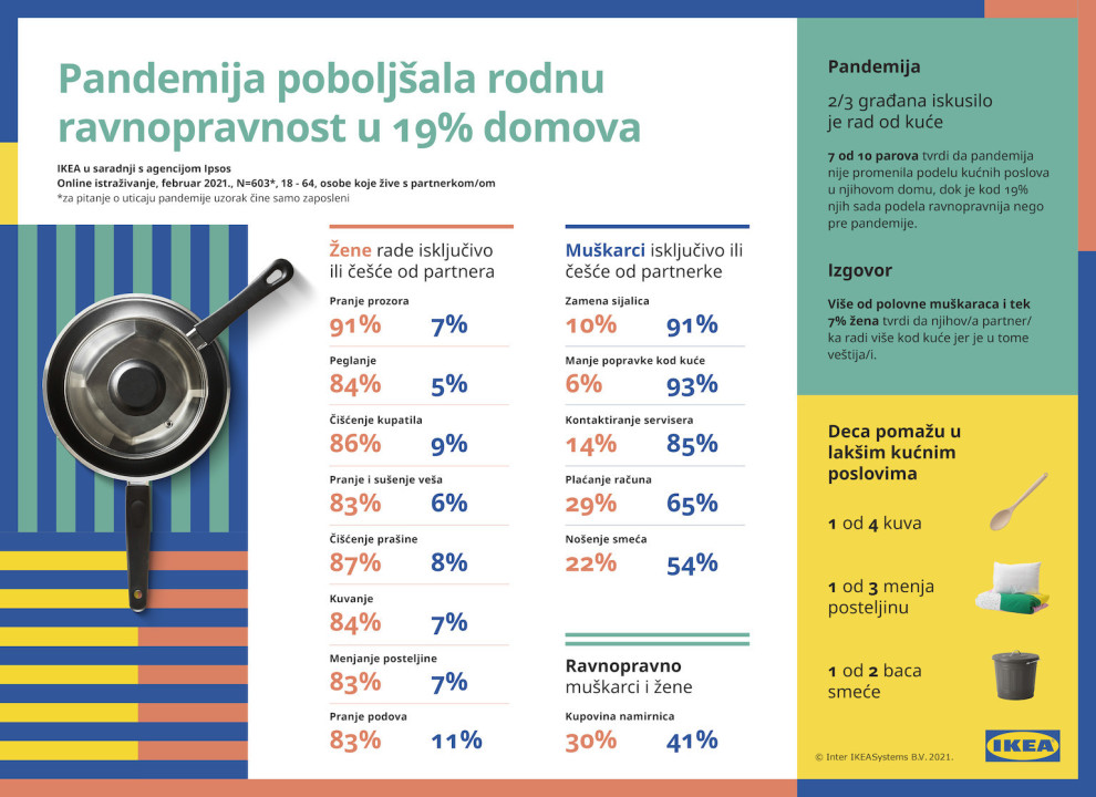 U sklopu kampanje „Ravnopravnost je bolja za sve“, kojom IKEA obeležava Međunarodni dan žena, agencija Ipsos sprovela je online istraživanje u februaru 2021, o uticaju pandemije i rada od kuće na podelu kućnih obaveza. Rezultati istraživanja, sprovedenog na 600 ispitanika, uzrasta od 18 do 64 godina, pokazali su da je 1/2 građana tokom pandemije iskusila rad od kuće, ali se kod 70 odsto parova situacija oko podele kućnih obveza nije promenila.