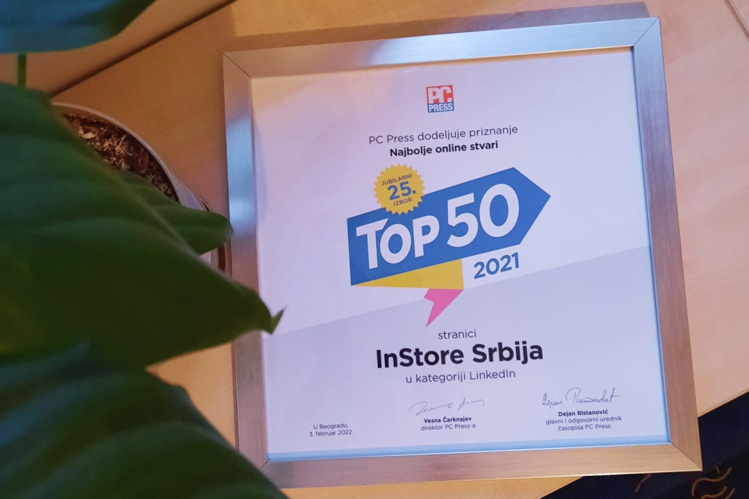 Ovom prilikom želeli bismo da se u ime celokupnog InStore Srbija tima zahvalimo organizatorima na dodeli ovog prestižnog priznanja. Drago nam je što je stručni žiri prepoznao kvalitet našeg kompanijskog profila InStore Srbija na kojem nas prati 5,885 kolega iz industrije. Želeli bismo da naglasimo značaj i drugog kompanijskog profila - InStore PR Srbija na kojem nas svakodnevno prati 9,542 pratilaca iz celog sektora.