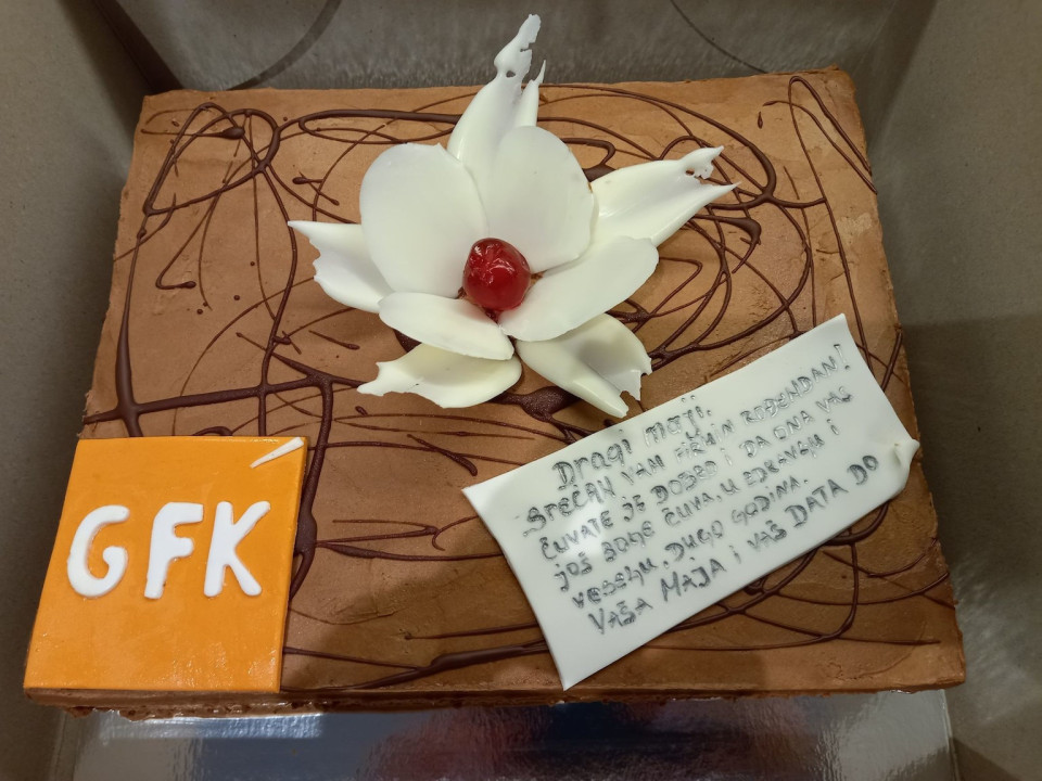 Jubilarnu godinu smo počeli tortom koju smo dobili od naših prijatelja i bivših kolega, a sada DATA DO ekipe... upravo onih koji su postavili temelje GfK u Srbiji. Veliko hvala, napiso je Ćirović.
