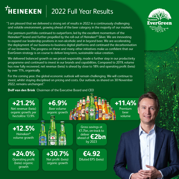 Drago mi je što smo tokom 2022. godine ostvarili snažne rezultate u okruženju koje je konstantno izazovno i promenljivo, ostvarujući viši rast u odnosu na rast celokupne kategorije piva na većini naših tržišta. Naš premium portfolio je nastavio da premašuje očekivanja, vođen odličnim rastom Heineken brenda i dodatno osnažen uvođenjem Heineken Silver brenda. Uvodimo inovacije kako bismo proširili lidersku poziciju u segmentu bezalkoholnog piva i pića izvan kategorije piva. Ubrzavamo primenu digitalnih platformi u našem poslovanju i nastavljamo smanjenje karbonskog otiska u našim pivarama. Napredak u okviru ovih i mnogih drugih inicijativa jasan je pokazatelj da je naša EverGreen strategija na putu da obezbedi dugoročno, održivo stvaranje dodatne vrednosti. Ostvarili smo uravnotežen rast, jer smo odgovorno sprovodili cenovnu politiku, napravili dalji korak u našem planu produktivnosti i nastavili da ulažemo u naše brendove i razvoj naših zaposlenih. U narednoj godini, globalni ekonomski izgledi će ostati izazovni. Nastavićemo da ulažemo, ali ćemo i dalje biti disciplinovani u pogledu cenovne politike i troškova. Naša očekivanja, koja smo prezentovali 30. novembra 2022, ostaju nepromenjena.
