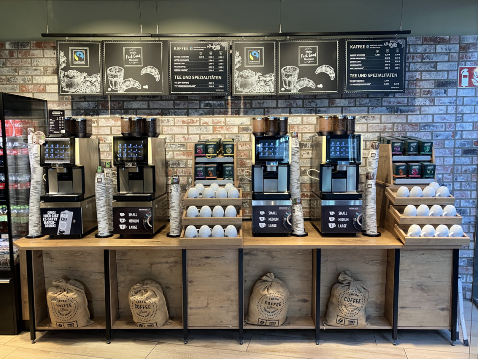 Številni aparati za kavo, nameščeni pri vhodu, omogočajo hitro postrežbo v jutranji prometni konici. Ponudba vključuje kavo za s seboj in skodelice za uživanje na kraju samem, kar omogoča jasno izbiro med možnostmi "za s seboj" ali "prigrizek v restavraciji".