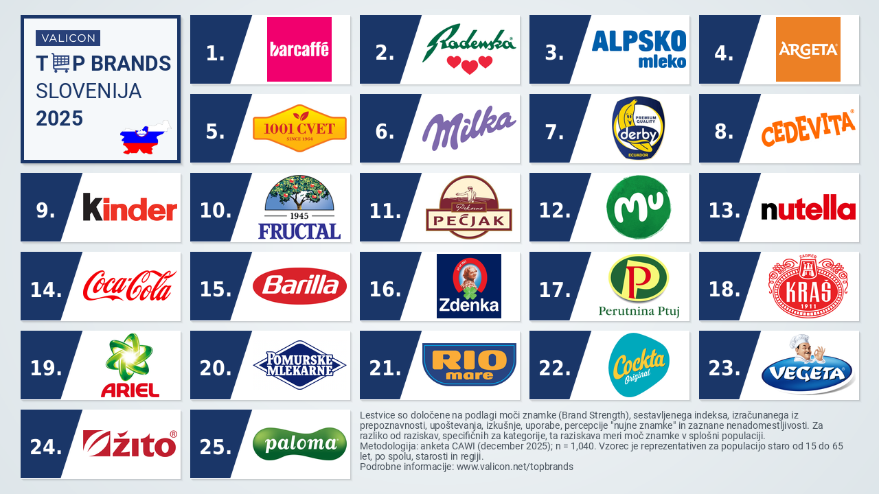 Raziskava razkriva, da v razmerah rasti diskontnih trgovcev in vse večjega pritiska trgovskih blagovnih znamk najmočnejše znamke ne le ohranjajo svojih pozicij, temveč jih celo krepijo. V Sloveniji prvih pet mest zasedajo izključno domače blagovne znamke: Barcaffè, Radenska, Alpsko mleko, Argeta in 1001 cvet. Med prvo deseterico jih je kar sedem, med 25 najmočnejšimi pa več kot polovica izvorno slovenskih.