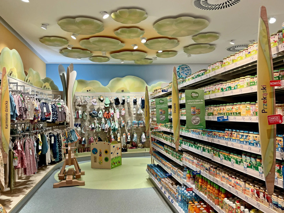 V drogeriji dm je namensko zasnovan otroški kotiček kot majhno igralno območje znotraj trgovine z dekorativnimi elementi v obliki lesa. Prostor, obdan z otroškim tekstilom in otroško hrano, ustvarja čustveno angažiranost med nakupovanjem.