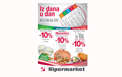 Trgovinska veriga Mercator-CG je v podgoriškem hipermarketu začela z akcijo "Iz dana u dan" (Iz dneva v dan), v okviru katere imajo kupci vsak delovni teden od ponedeljka do petka možnost, da izberejo izdelke v akciji, ki je na sporedu tisti dan. „Sladki torek." je namenjen vsem, ki se radi posladkajo.