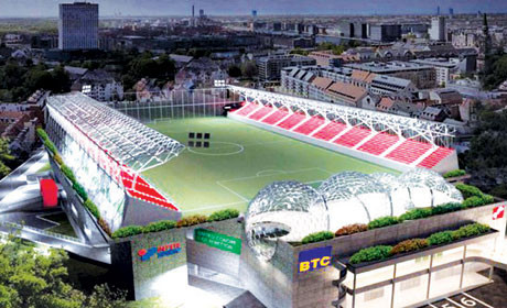 Danes ob 10.uri zjutraj so odprli nov trgovinski center Stadion, ki se nahaja v beograjskem naselju Voždovac, v Zaplanjski ulici. Na strehi je nogometno igrišče.To je po velikosti četrti objekt v Evropi, zanimivost pa je, da ima na strehi nogometno igrišče in predstavlja svetovno znamenitost. Stadion je zgrajen po UEFA standardih z možnostjo, da sprejme 5.000 gledalcev.