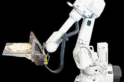 Drugi robot nabrizga na testo optimalno količino paradižnikove mezge in jo razmaže, tretji robot pico vstavi v pečico, četrti pa jo izvleče in v štirih minutah je na mizi.