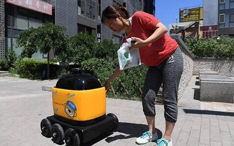 Na obrobju Pekinga na tihi stanovanjski ulici vsak dan osnovne potrebščine pred hiše dostavlja rumeno-črna robotska kocka v velikosti pralnega stroja.