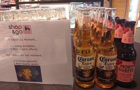 V času epidemije koronavirusa nekaterim ne zmanjka smisla za humor. Tako so trgovine Shop & Go, ki delujejo pod okriljem belgijske trgovinske verige Delhaize, ponudile akcijo, pri kateri ob nakupu dveh piv Corona dobiš zastonj steklenico kraft pivovarja Mort Subite (v dobesednem prevodu = nenadna smrt).