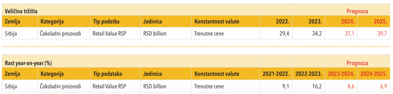 Prema rezultatima istraživanja kompanije za analizu podataka Euromonitor International, čokoladni konditorski proizvodi će imati značajan rast trenutne vrednosti u Srbiji u 2024. Ova kategorija se suočila sa značajnim porastom jediničnih cena u 2023. godini, pri čemu je rast cena malo usporen u 2024. Uprkos inflatornim pritiscima, koji su uticali na to da potrošači budu osetljivi na cene, čokoladna konfekcija je profitirala jer je percipirana kao pristupačan užitak, pošto su potrošači nastojali da se počaste, izbegavajući pritom veće kupovine.