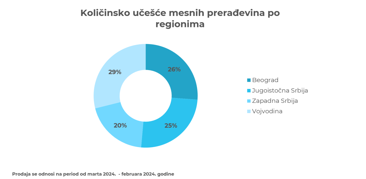 Kada posmatramo količinsku prodaju mesnih proizvoda prema regionima, podaci pokazuju da je u Vojvodini ostvareno 28,9% ukupne prodaje, u Beogradu 26,2%, u jugoistočnoj Srbiji 25,2%, dok je u zapadnoj Srbiji zabeleženo 19,7% ukupne količinske prodaje.