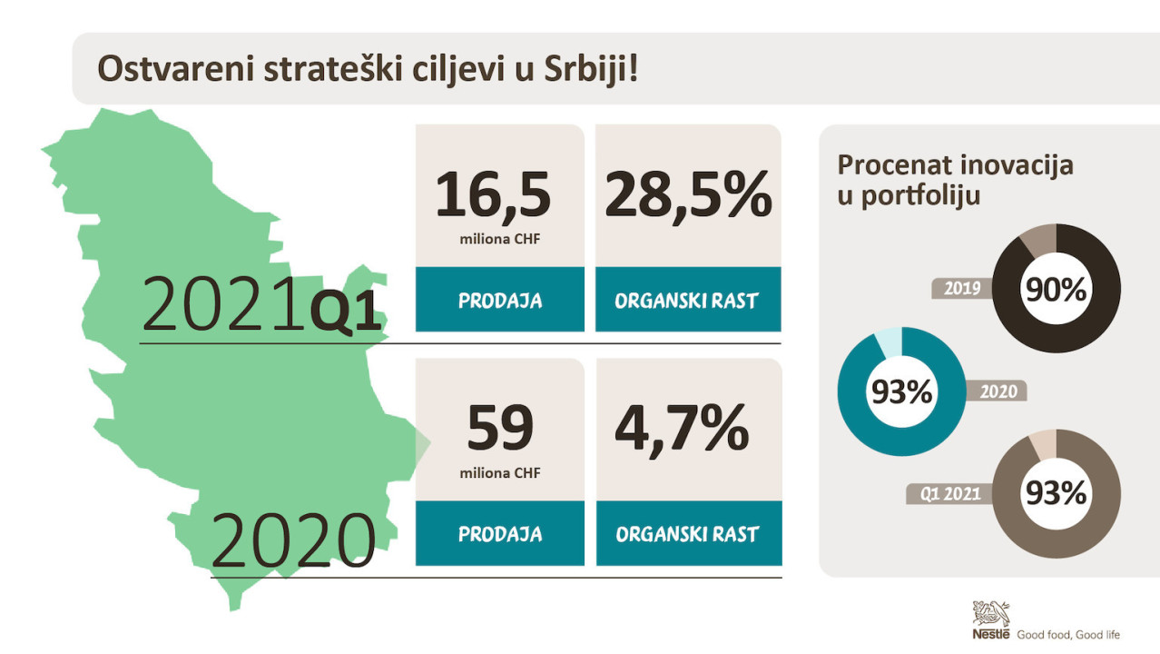 Marjana Davidović, generalna direktorka Nestlé Adrijatik južni region (Srbija, Crna Gora, Severna Makedonija) istakla je da je u Srbiji u prvom kvartalu 2021. godine ostvarena rekordna prodaja od 16,5 miliona švajcarskih franaka, što je za 3,2 miliona više nego u istom periodu prošle godine.