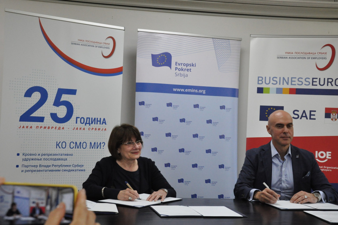 Memorandum su potpisali Jelica Minić, predsednik Evropskog pokreta u Srbiji, i Miloš Nenezić, predsednik Unije poslodavaca Srbije i predsedavajući Socijalno ekonomskog saveta Republike Srbije.