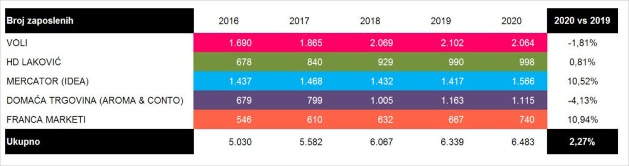 Vodeći lanac u Crnoj Gori ostvario je prihode od gotovo 219 miliona evra, HD Laković je na drugom mestu sa 136 miliona evra i padom od 17%, a najveći pad prodaje pretrpela je Domaća trgovina (Aroma i Conto), čiji je promet smanjen za 19%. Ukupni prihodi svih pet najvećih trgovaca u prošloj godini iznosili su 587 miliona evra, što je 90 miliona evra manje nego 2019. godine.