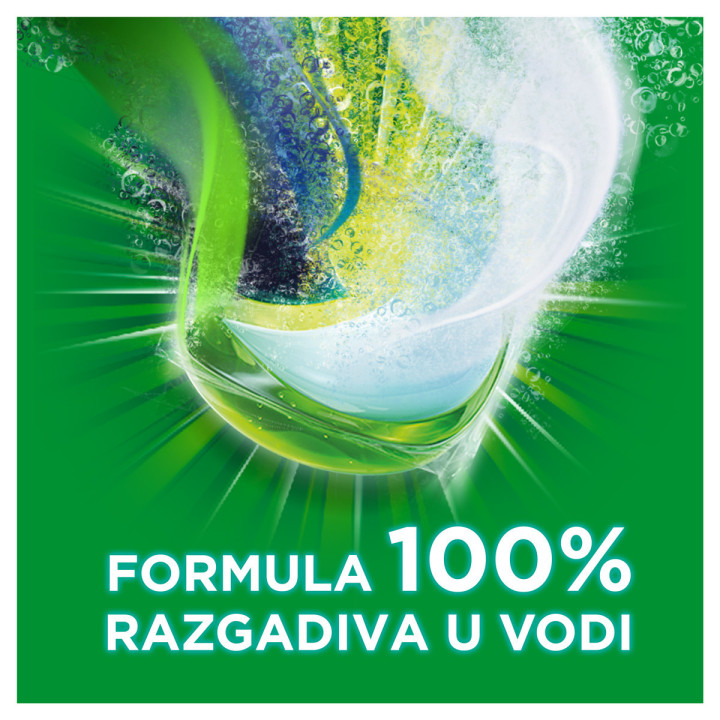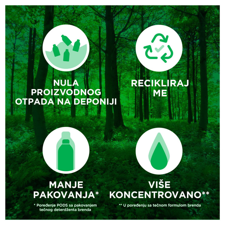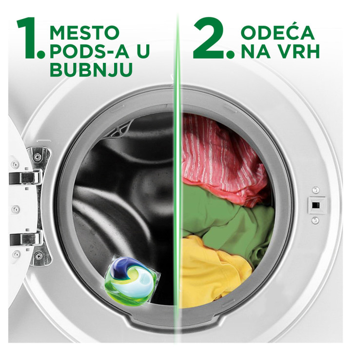 Zahvaljujući ovoj ekskluzivnoj inovaciji, pranje veša u kučnim uslovima može postati ekološki osvešćen proces, jer Ariel Allin1 PODs omogućava poboljšano pranje čak i u hladnoj vodi. Imajte na umu da, kada peremo odeću, čitavih 60% ekološkog otiska nastaje zbog upotrebe mašine za pranje veša (evropski prosek), i to uglavnom zbog zagrevanja vode.