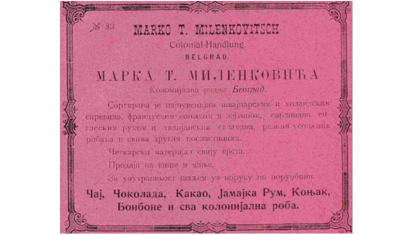 Kolonijalna radnja Marka T. Milenkovića, oglas iz 1905. godine.