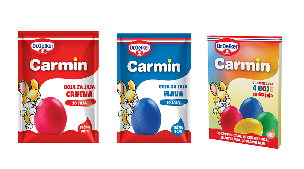 Dolaze u tri pakovanja – Carmin plava i Carmin crvena boja dovoljna za farbanje 10 jaja, a za one koji žele da se njihova uskršnja korpa rascveta u svim prolećnim bojama, tu je pakovanje Carmin koje sadrži četiri boje za jaja: crvenu, plavu, žutu i zelenu, dovoljne za farbanje 60 jaja.