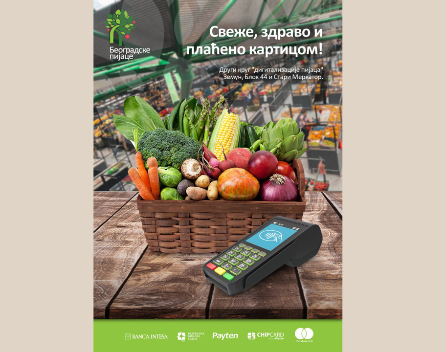 Mogućnost bezgotovinskog plaćanja biće uvedena i na pijacama Stari Merkator, Zemun i Blok 44, tako da će posetioci ovih pijaca robu kupljenu na pijačnim tezgama moći da plate brže i lakše, platnim karticama i mobilnim telefonom, bez prethodne posete bankomatu.
