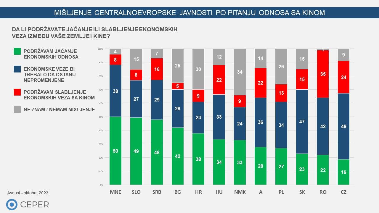 Kompanija CEPER je sprovela istraživanje javnog mnjenja u 12 zemalja Centralne Evrope sa ciljem boljeg razumevanja šta Evropljani misle o odnosu svoje zemlje i Kine, a rezultati pokazuju da postoji jasna podela između severa i juga po tom pitanju. U šest zemalja centralno-evropskog regiona, a to su Bugarska i većina zemalja nekadašnje Jugoslavije, relativna većina javnosti se zalaže za jačanje ekonomskih odnosa sa Kinom. 50% Crnogoraca, 48% Srba i 49% Slovenaca želi da ojača ekonomske veze sa Kinom. U Hrvatskoj (38%), Severnoj Makedoniji (33%) i Bugarskoj (42%), takođe, najveći procenat ispitanika podržava jače ekonomsko povezivanje. Čak 34% ispitanika iz Severne Makedonije, kandidata za članstvo u EU i članice NATO-a, nije odgovorilo na ovo pitanje.