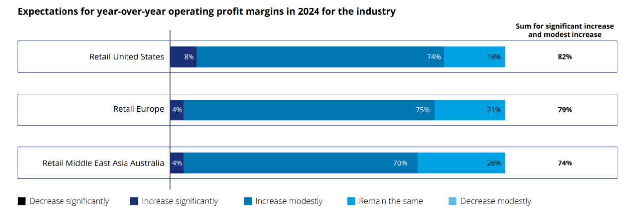 Globalna maloprodajna industrija, takođe, ima optimistična očekivanja za operativne profitne marže. Većina trgovaca (74%) predviđa skromno povećanje, što ukazuje na ukupno poverenje u finansijske performanse sektora. Nijedan ispitanik nije očekivao neto smanjenje prihoda u celom sektoru.