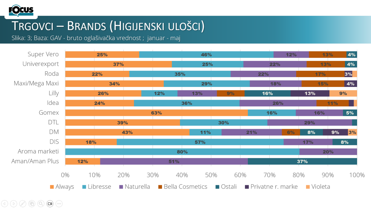 Treći dijagram prikazuje udeo za najjače brendove po bruto oglašivačkoj vrednosti u kategoriji Higijenski ulošci kod odabranih trgovca za period od januara do maja 2024. godine. Libresse je imao najveći udeo u poređenju prema ostalim brendovima kod Aroma marketa – 80% bruto oglašivačke vrednosti u Aroma lifletima u toj kategoriji. Always je u Gomexu zabeležio najveći kvalitativni udeo od 63% u odnosu na ostale brendove, a Naturella 51% u Amanu. Privatne robne marke sa najvećim udelima kod drogerija.