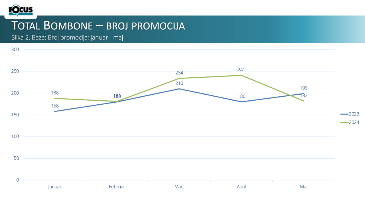 U novom InStore izdanju, za rubriku InFokus: Bombone, Focus Research je pripremio analizu promotivnih aktivnosti po kategorijama, broju promocija, te top brendovima za period od januara do maja 2023. i 2024. godine.